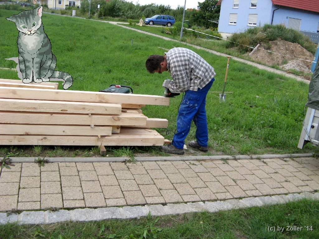 Die Balken müssen übereinander liegen in den Ecken. Für die Verzahnung wird die Balkendicke mit einer Stichsäge langsam halbiert. Es soll ja ein gerader Schnitt werden.