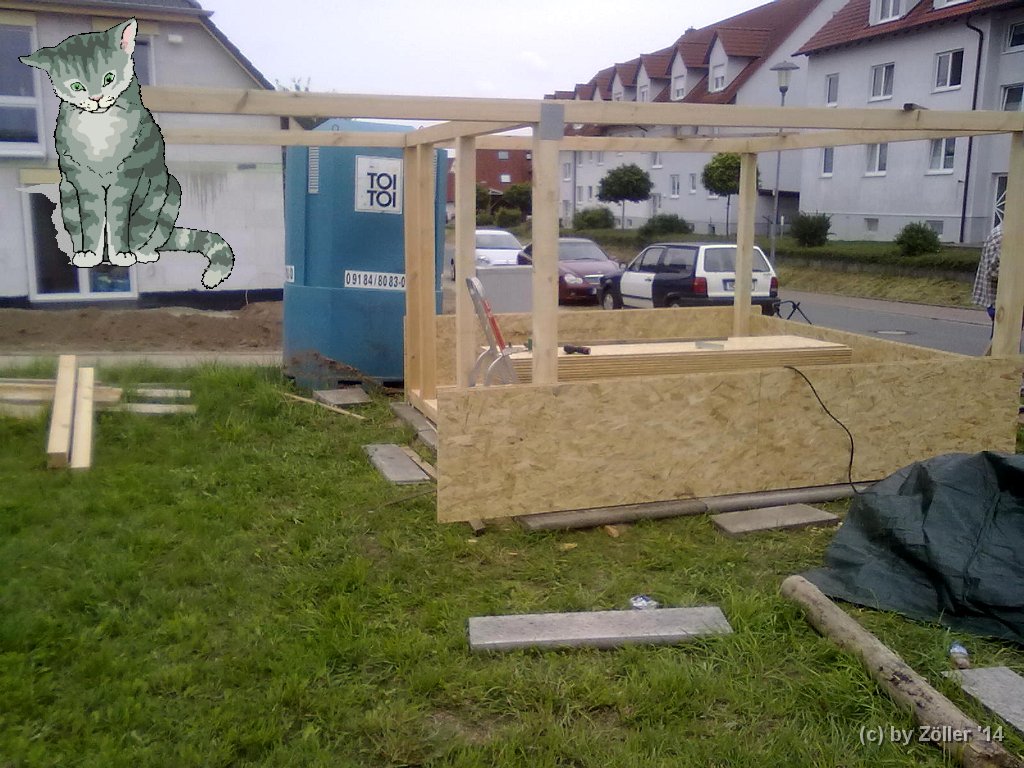 Teilweise verbrettert mit OSB-Platten, auf Rasenkantensteinen gelegt, zuvor mit Sand unterfüttert. Die Hütte wandert später auf die Nordseite vom Grundstück.