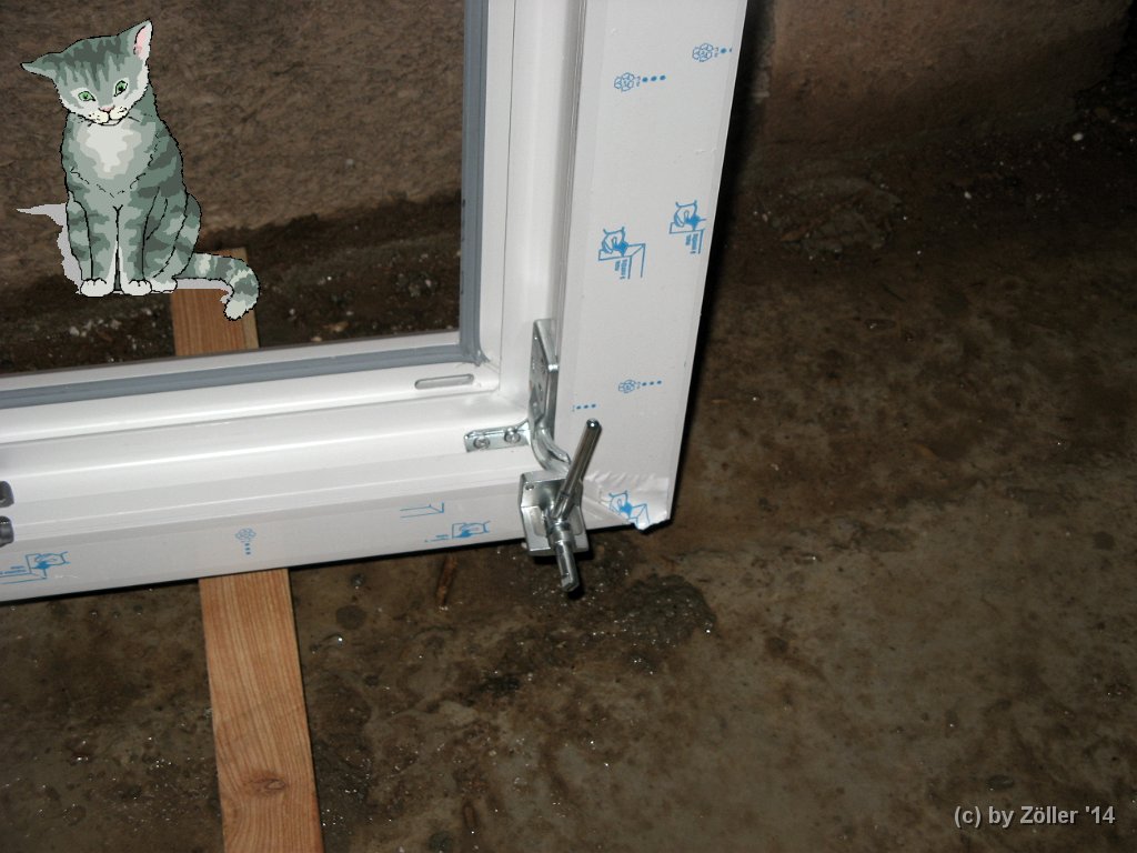 Der Haltestift muss in dieser Stellung (ziemlich senkrecht und nach vorne) stehen, sonst kann das Fenster nicht eingesetzt werden.