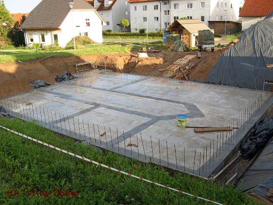 Bodenplatte gestrichen statt Bitumenbahn, da die Außenwand mit Stäben versehen ist.