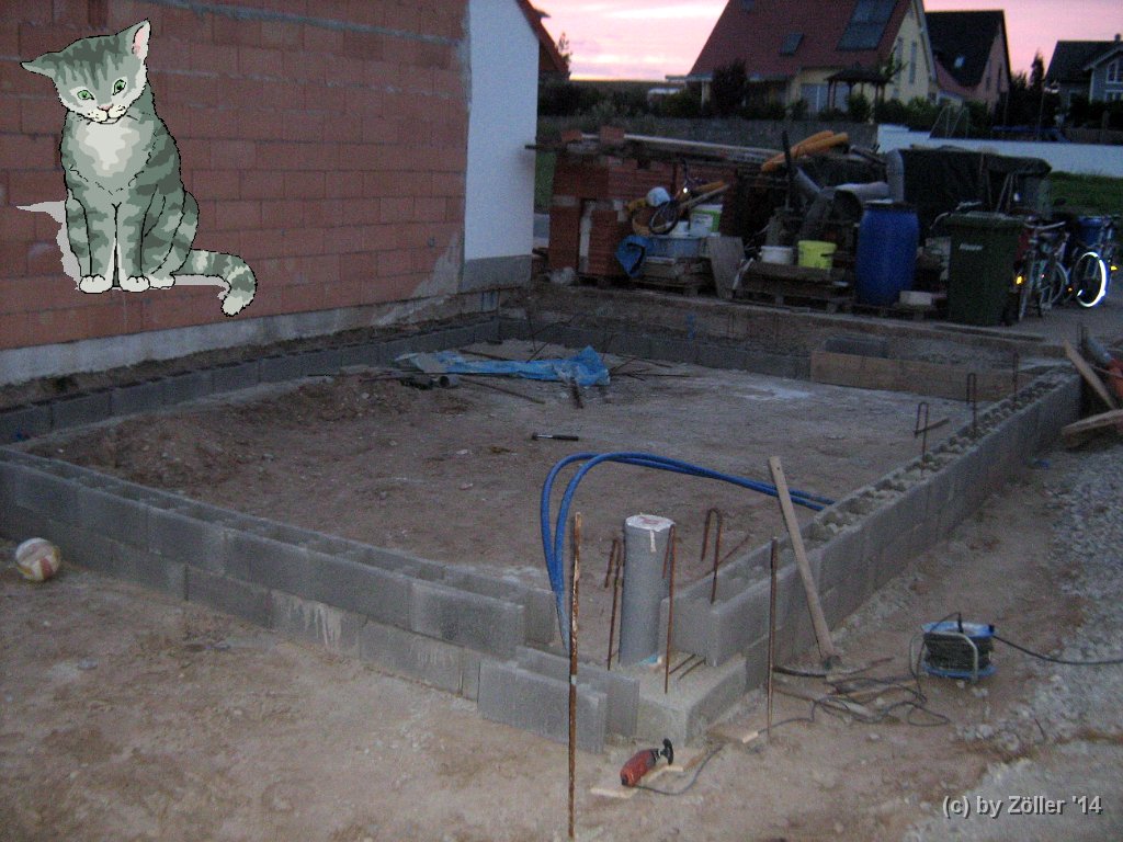 Betonsteine soweit mal geschlichtet, aber das Versorgungsrohr muss noch "umbaut" werden. Ist leider doch etwas in die Wand mit gerutscht.